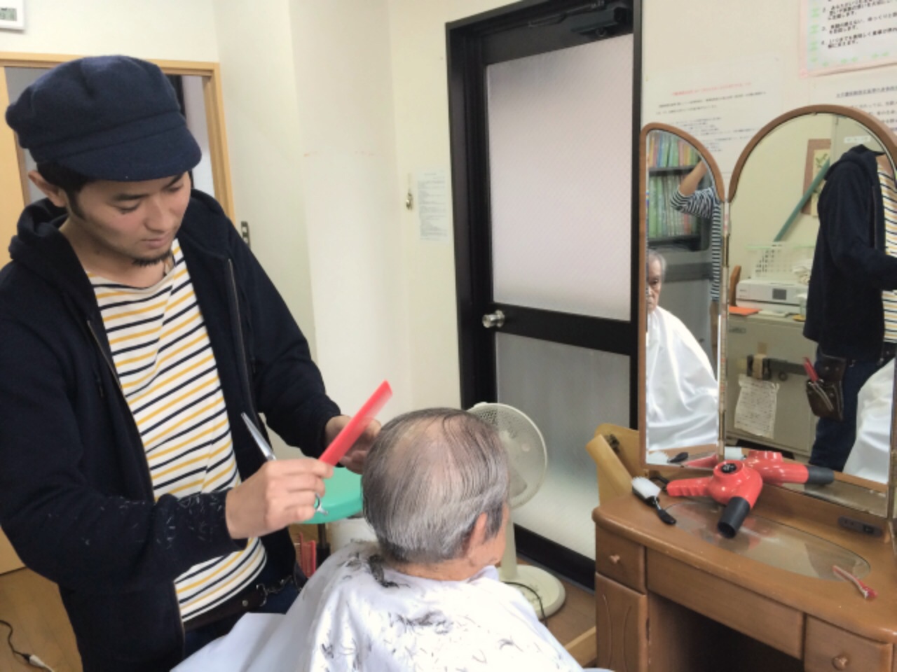 最初は車椅子の方のカットや、まっすぐな姿勢の辛いお年寄りのカットに戸惑いましたが、最近はだいぶ僕もお年寄りの方々も慣れてくれて楽しくやってます。